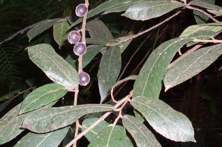 The figs, up to 1 inch across, are dull purple and clustered on short stalks. They are frequently fed upon by Flying Foxes.